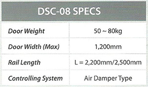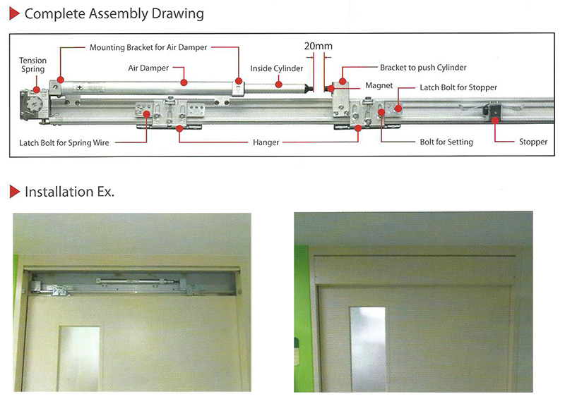 | Model : DSC-08-self-close sliding door device can be opened easily by manually. It will close automatically by tension pulling spring and air dumper will slow down the closing speed when the door is almost fully close. It is Eco friendly product and economical device without any electric power supply. |